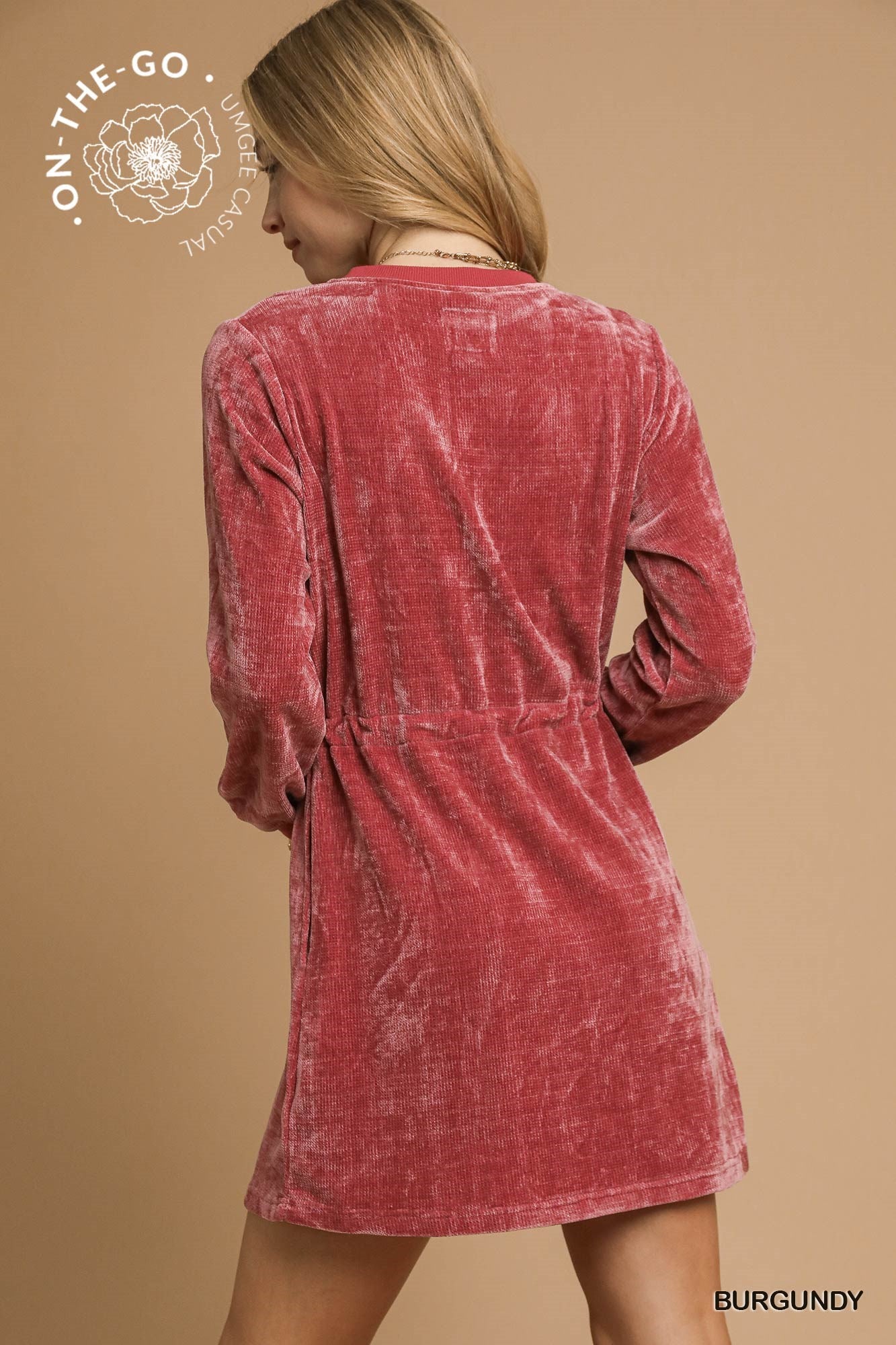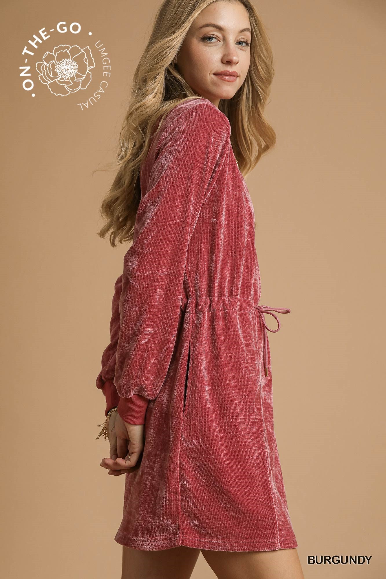 • Soft stretch velour with a subtle sheen• Crew neck• Long balloon sleeves with ribbed cuffs• Elastic waist with drawstring tie• Cinched waist• Not Lined