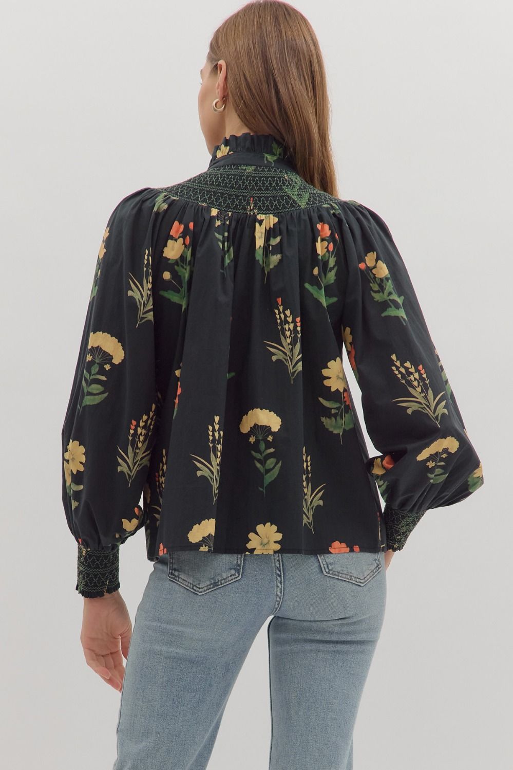 Floral print long sleeve top featuring smocked yoke and ruffled mock neck. Button closure at front. Smocked cuffs. Unlined. Woven. Non-sheer. Lightweight.