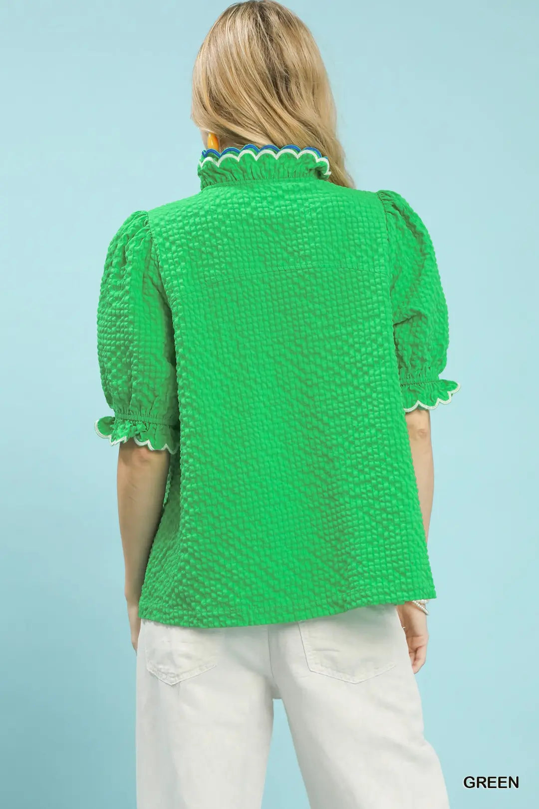 • Textured blouse• Scalloped trim neckline with contrast accents• Puff sleeves with elastic ruffle hem• Not Lined