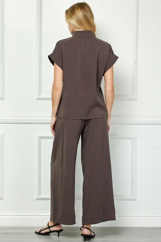 This relaxed button-down top offers effortless elegance with a soft, fluid drape. Designed with a classic collar, short rolled sleeves, and a front self-tie detail, it creates a flattering silhouette that feels both polished and easy. The lightweight woven fabric adds movement and comfort, making it perfect for warm days or layered looks. Style it loose or tied at the waist for versatile day-to-night wear.