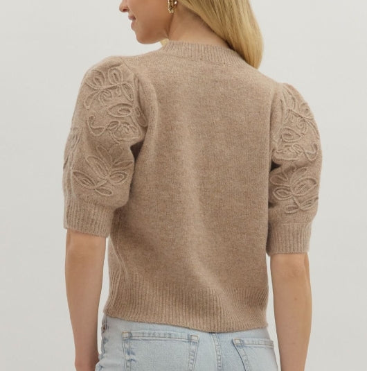 CUTE SHORT SLEEVE SWEATER WITH EMBROIDER APPLIQUE ON THE PUFF SLEEVES