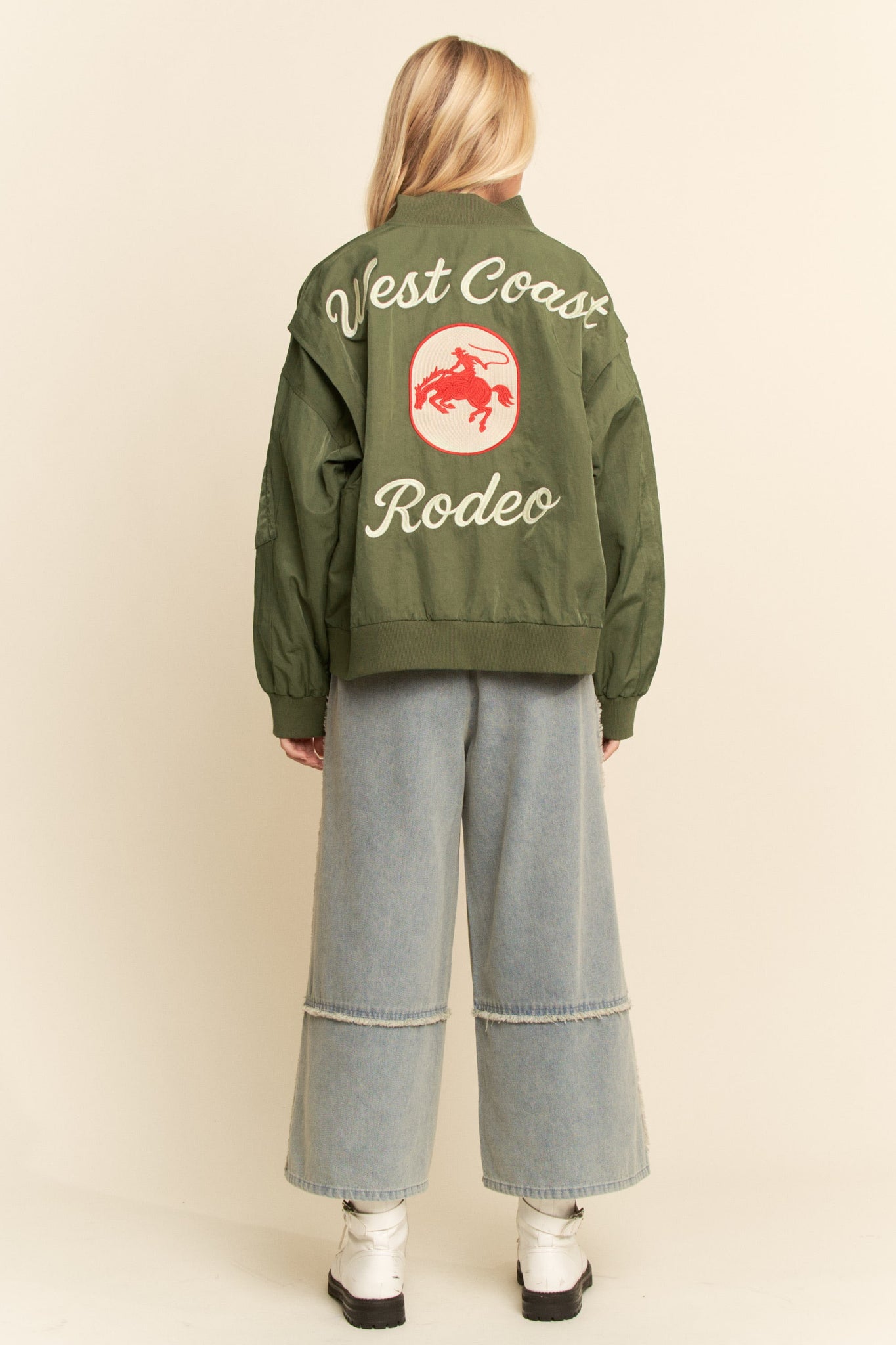 OLIVE GREEN BOMBER JACKET WITH EMBROIDERED WILD WEST HORSE ON THE BACK AND WEST COAST COWBOY. PERFECT ADDITION TO YOUR CLOSET FOR A GOOD WILD WEST TIME.